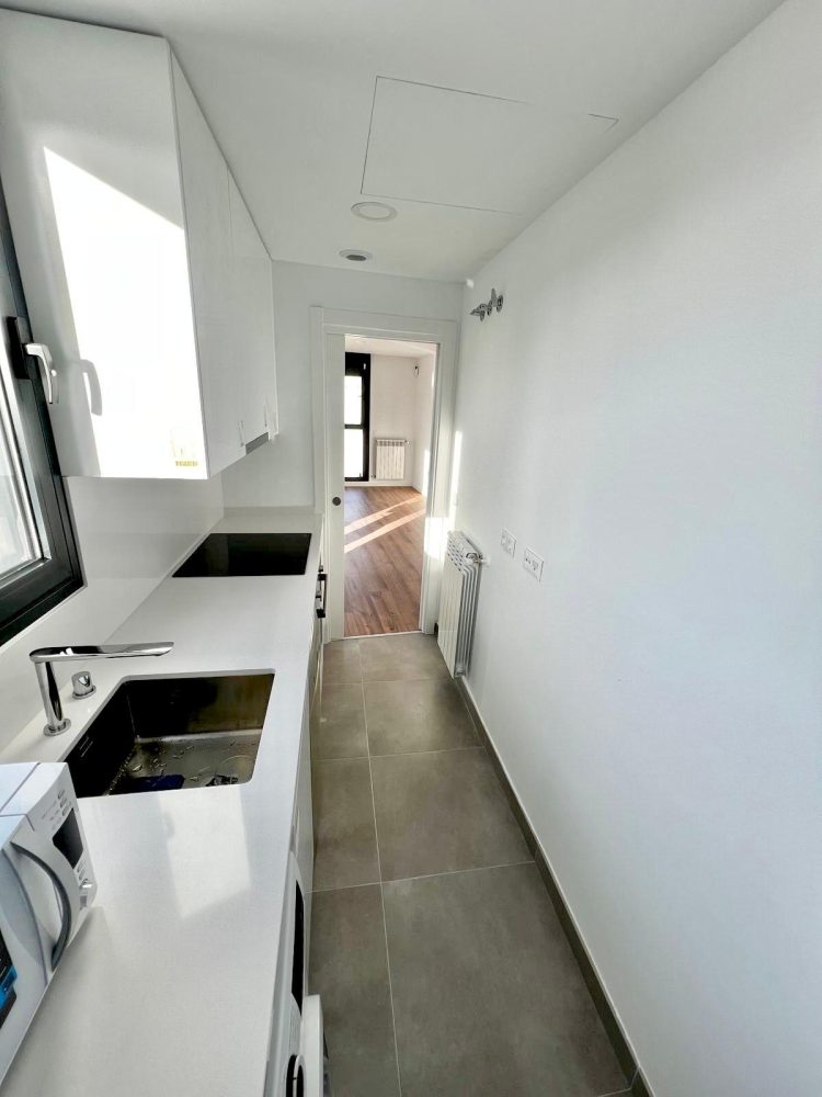 * COCINA independiente exterior. Completamente amueblada y equipada con todos los electrodomésticos necesarios para el uso diario (frigorífico, lavadora, lavavajillas, microondas, vitrocerámica, campana extractora y horno). Dispone de muebles superiores e inferiores de madera blancos con gran capacidad de almacenaje, fregadero amplio instalado bajo encimera. Gran ventana exterior favoreciendo ventilación y luz natural.