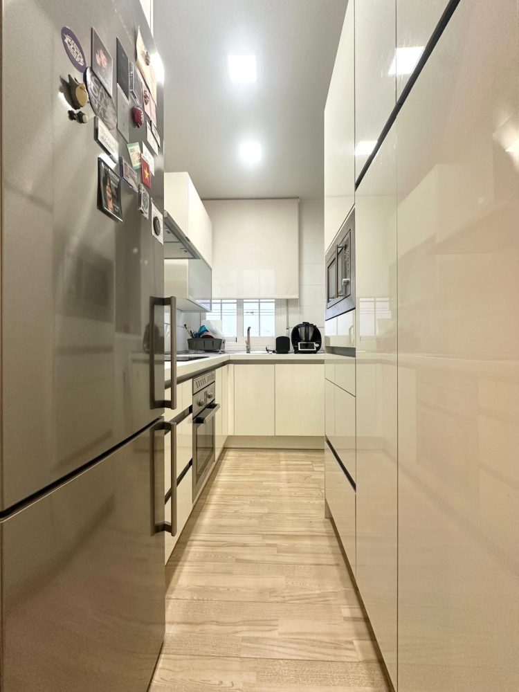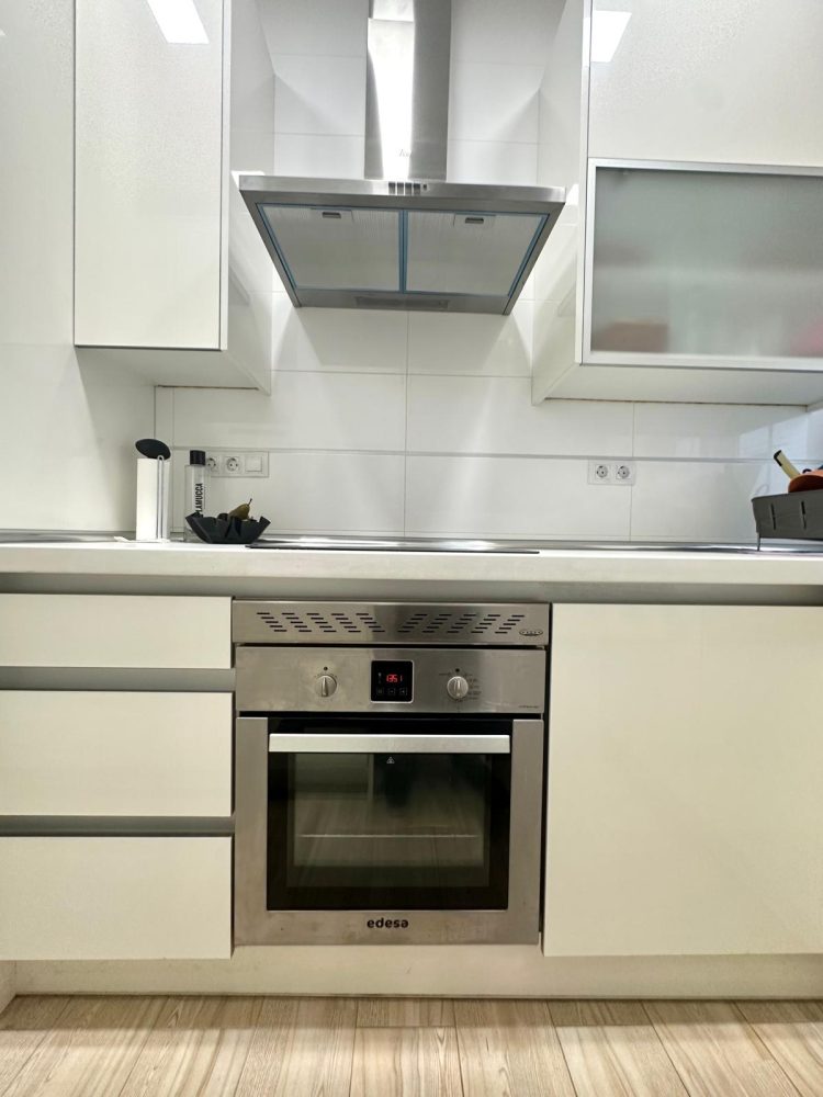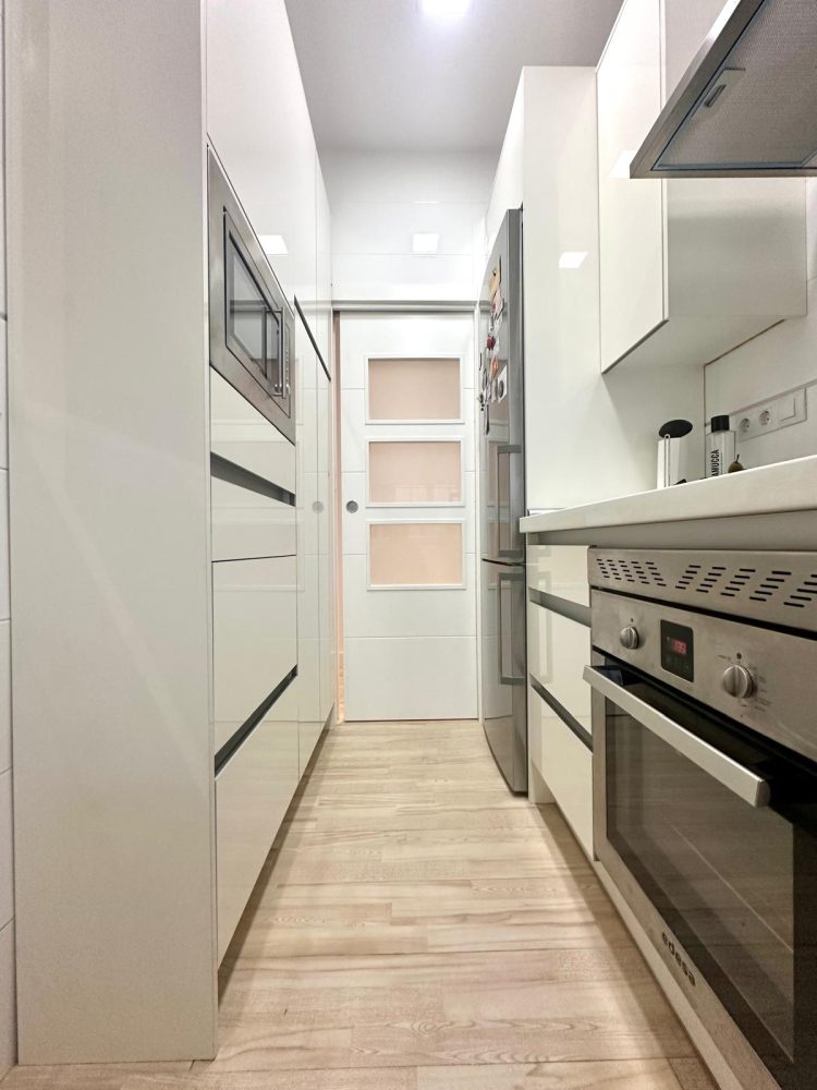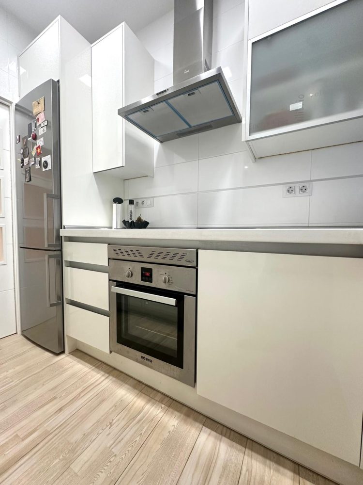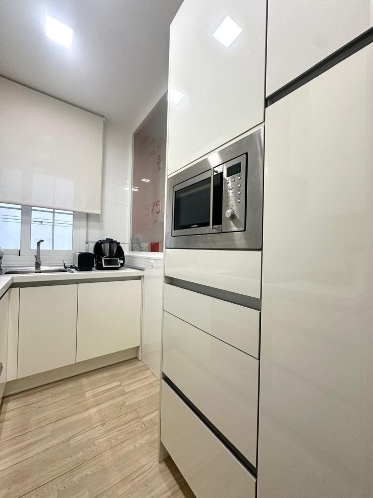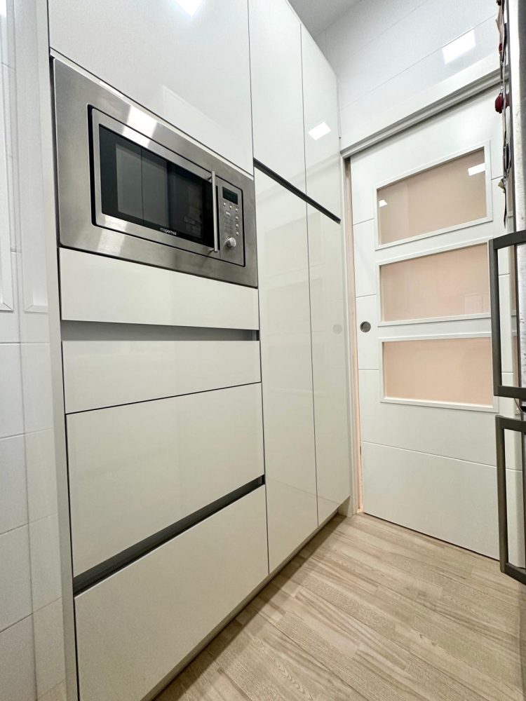 * MODERNA COCINA independiente COMPLETAMENTE AMUEBLADA y equipada con electrodomésticos de primeras marcas (frigorífico, horno, vitrocerámica, campana extractora, microondas y lavavajillas). La misma cuenta con mampara de cristal con vistas al salón que favorece la iluminación.