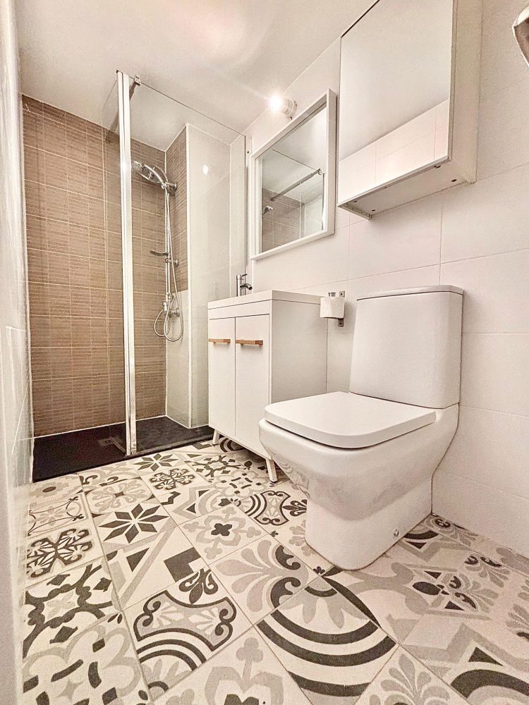 * BAÑO COMPLETO con mueble de baño con un seno, wc, y plato de ducha con mampara de cristal.