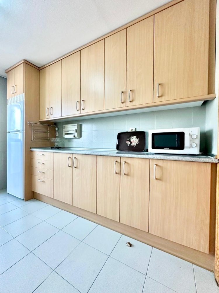 * COCINA independiente exterior. Completamente amueblada y equipada con todos los electrodomésticos necesarios para el uso diario (frigorífico, lavadora, lavavajillas, microondas, vitrocerámica, campana extractora y horno). Dispone de muebles superiores e inferiores de madera blancos con gran capacidad de almacenaje, fregadero amplio instalado bajo encimera. Gran ventana exterior favoreciendo ventilación y luz natural.