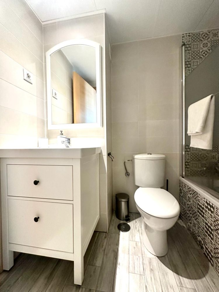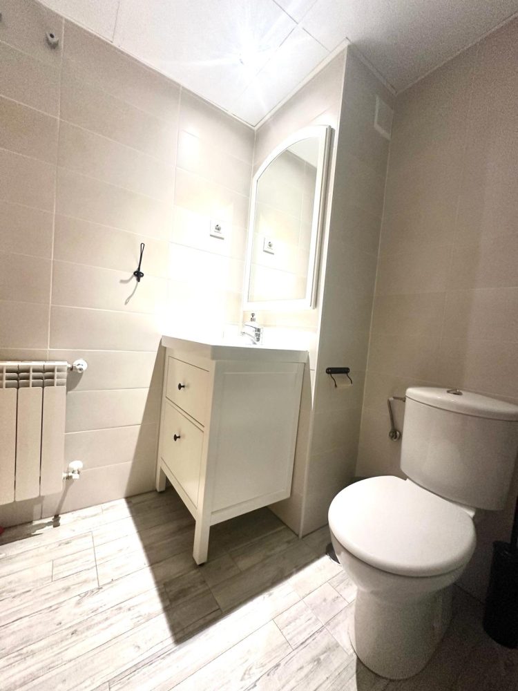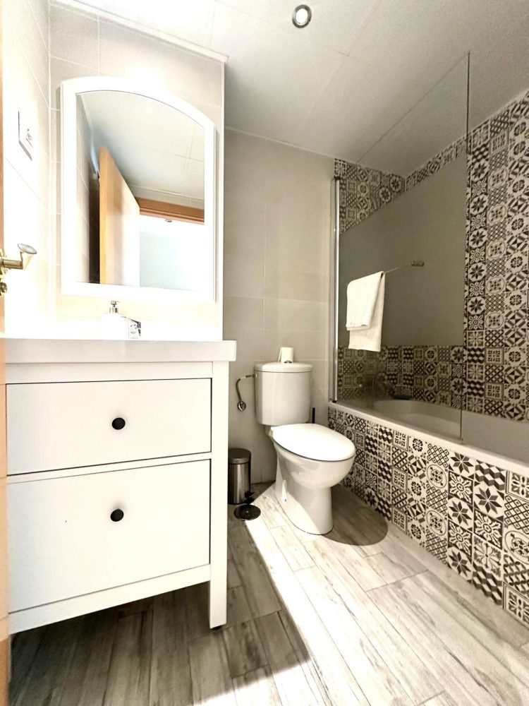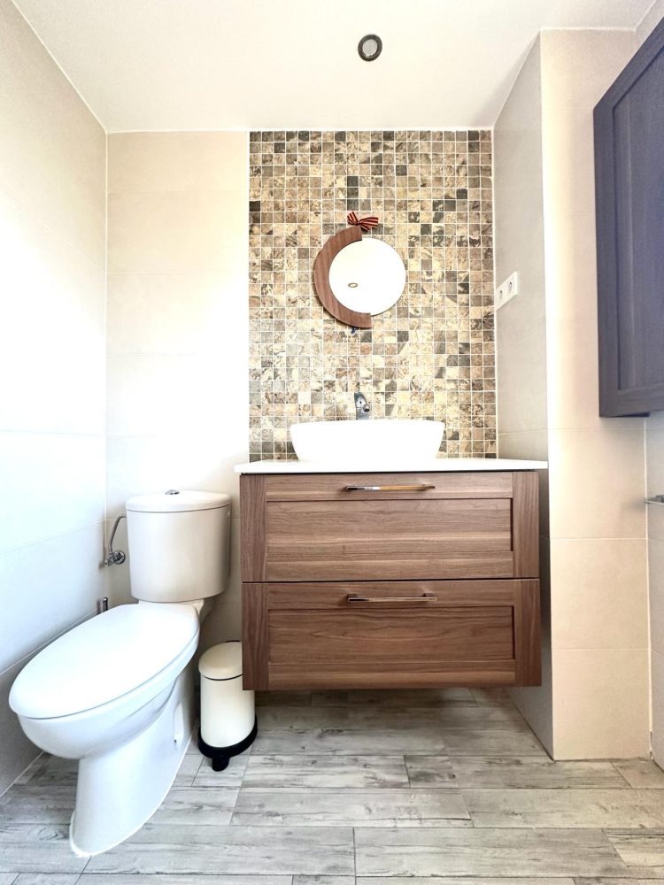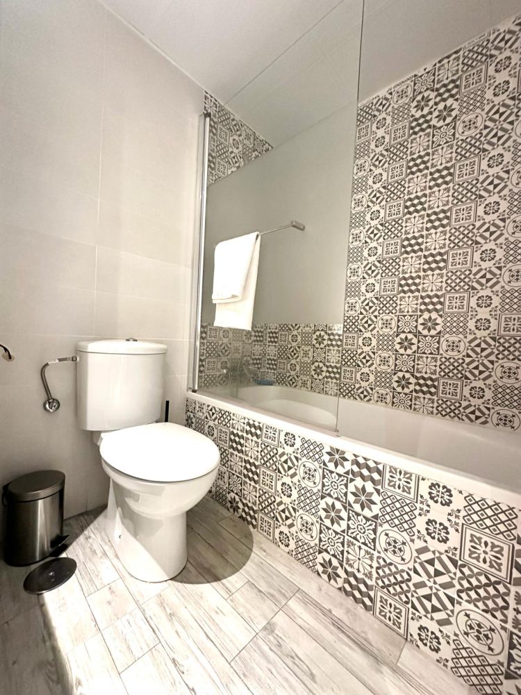 *BAÑO DE SERVICIO con alicatado en tonos claros que aportan al mismo un estilo actual y juvenil. El mismo dispone de AMPLIA BAÑERA CON MAMPARA, mueble de baño lacado en blanco con cajones y wc con tapa.