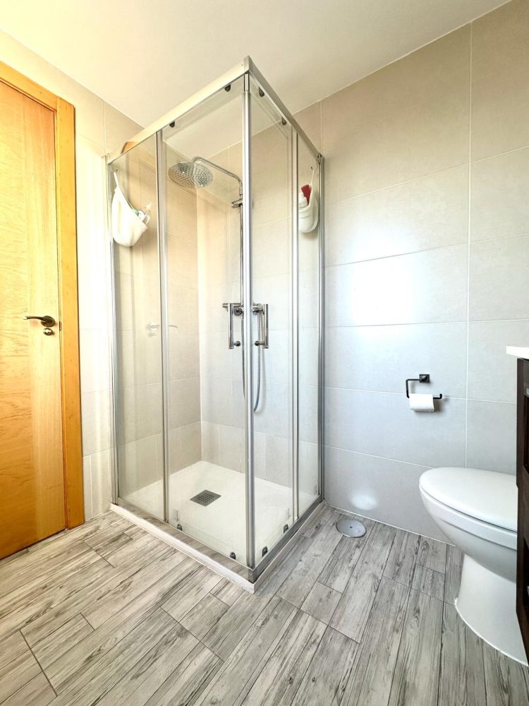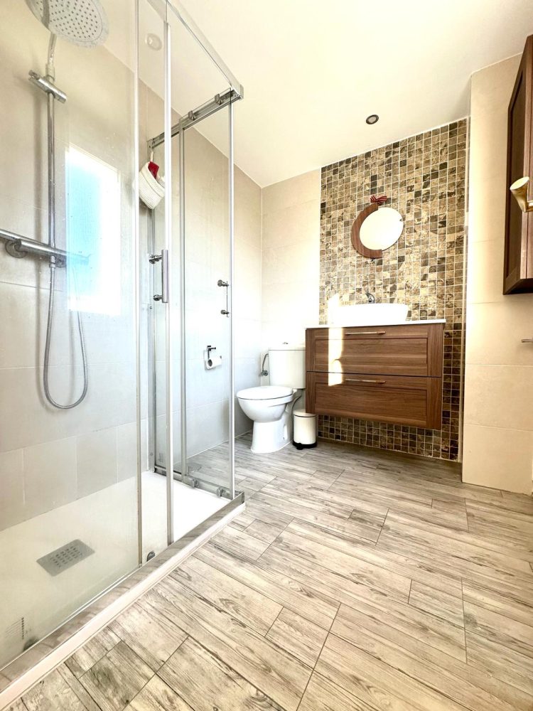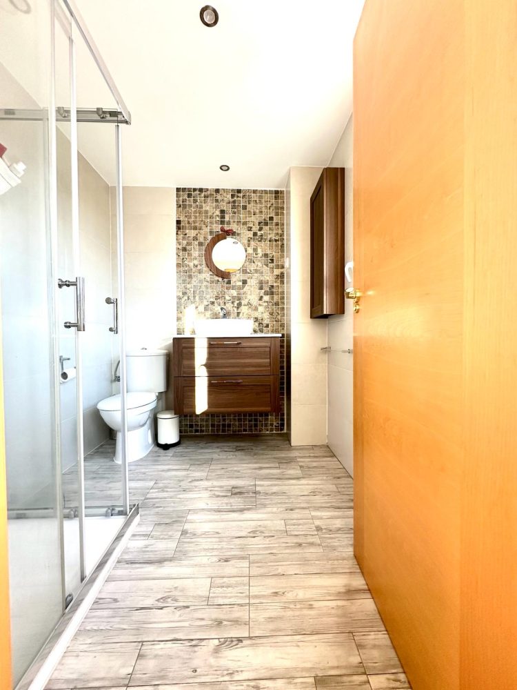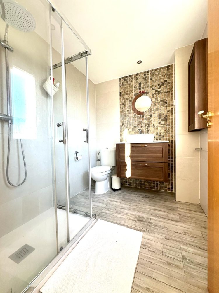 -MODERNO BAÑO SUITE EXTERIOR. Dispone de mueble de baño con 1 seno, AMPLIO PLATO DE DUCHA CON MAMPARA y wc.