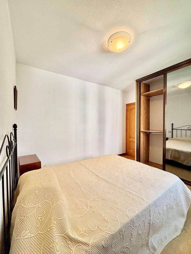 * DORMITORIO PRINCIPAL el cual cuenta con cama doble, 2 mesitas de noche de madera, cabecero de forja, armario empotrado de madera revestido en su interior con 3 puertas correderas con amplios espejos, doble ventana, aportando mucha luz natural al ambiente.