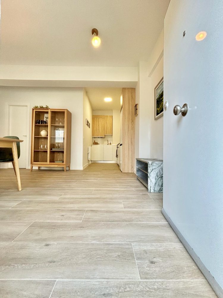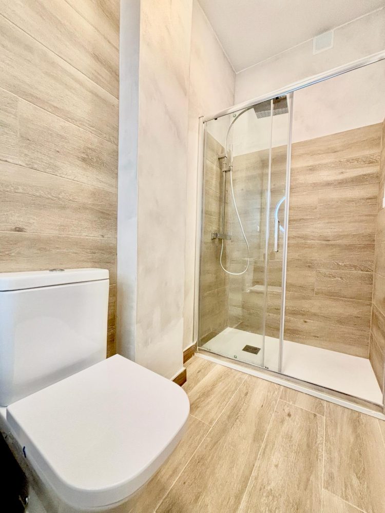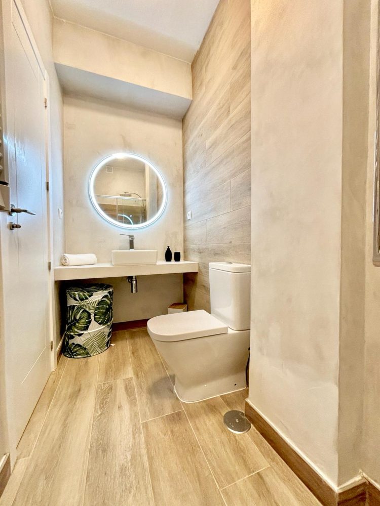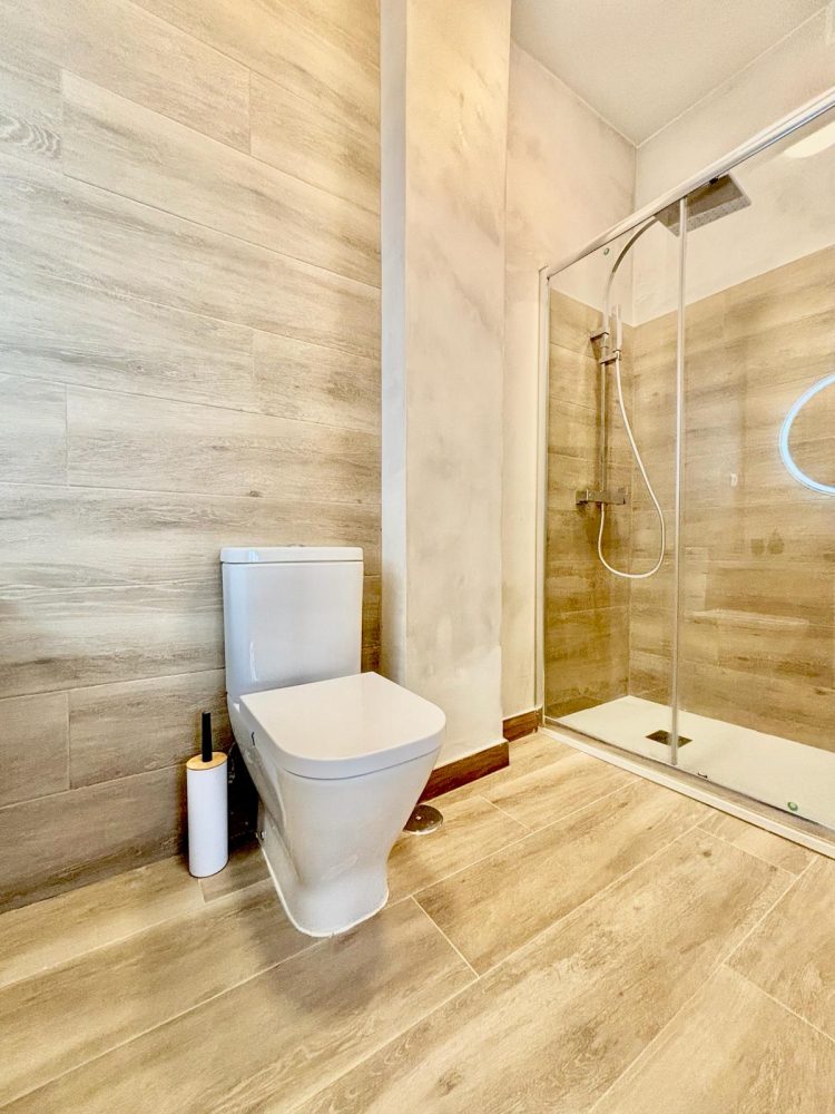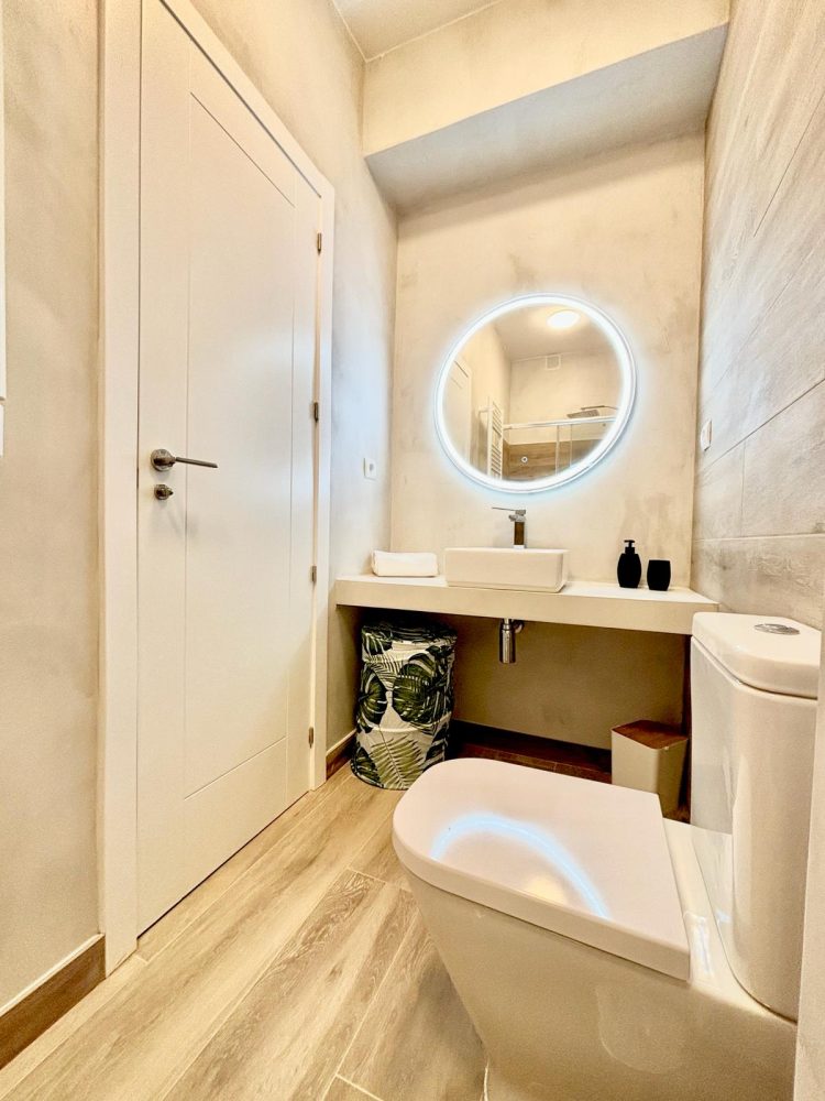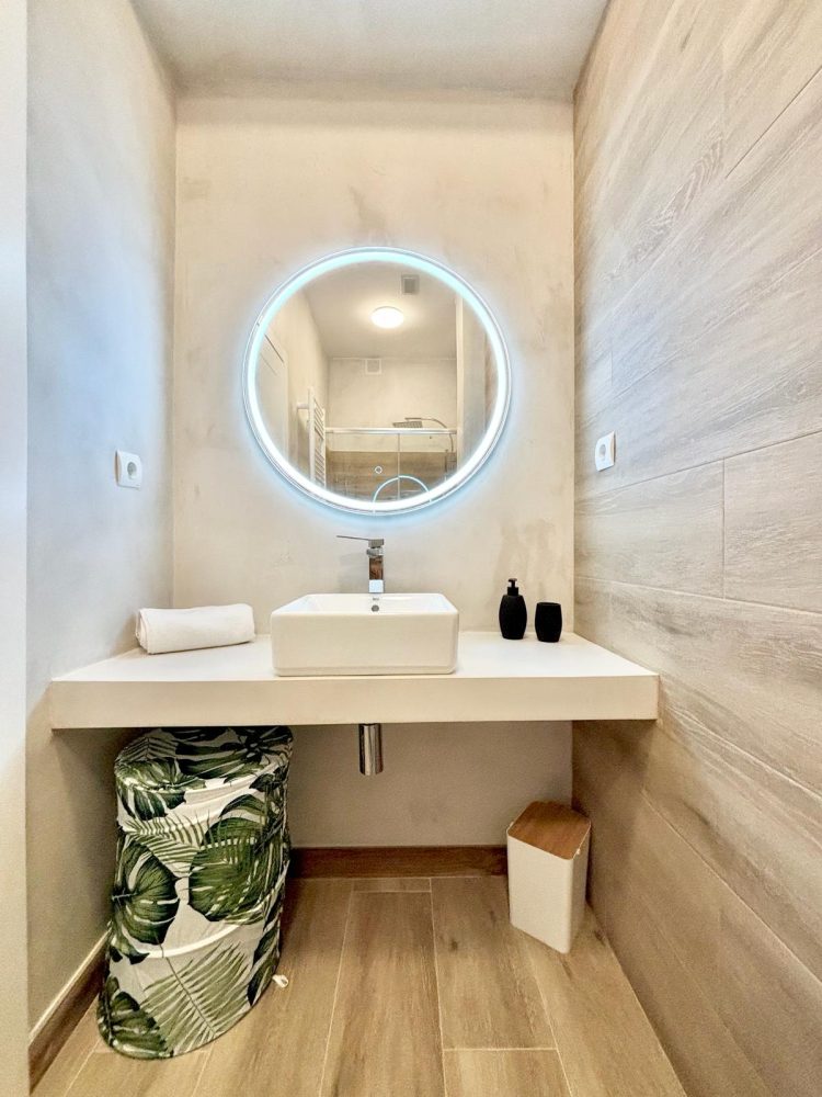 * MODERNO Y ACTUAL BAÑO COMPLETO con extractor. El mismo dispone de todos los saneamientos nuevos, moderno lavabo con grifería sobre encimera de microcemento y espejo con iluminación led táctil, gran plato de ducha con mampara de cristal, wc y toallero radiador.