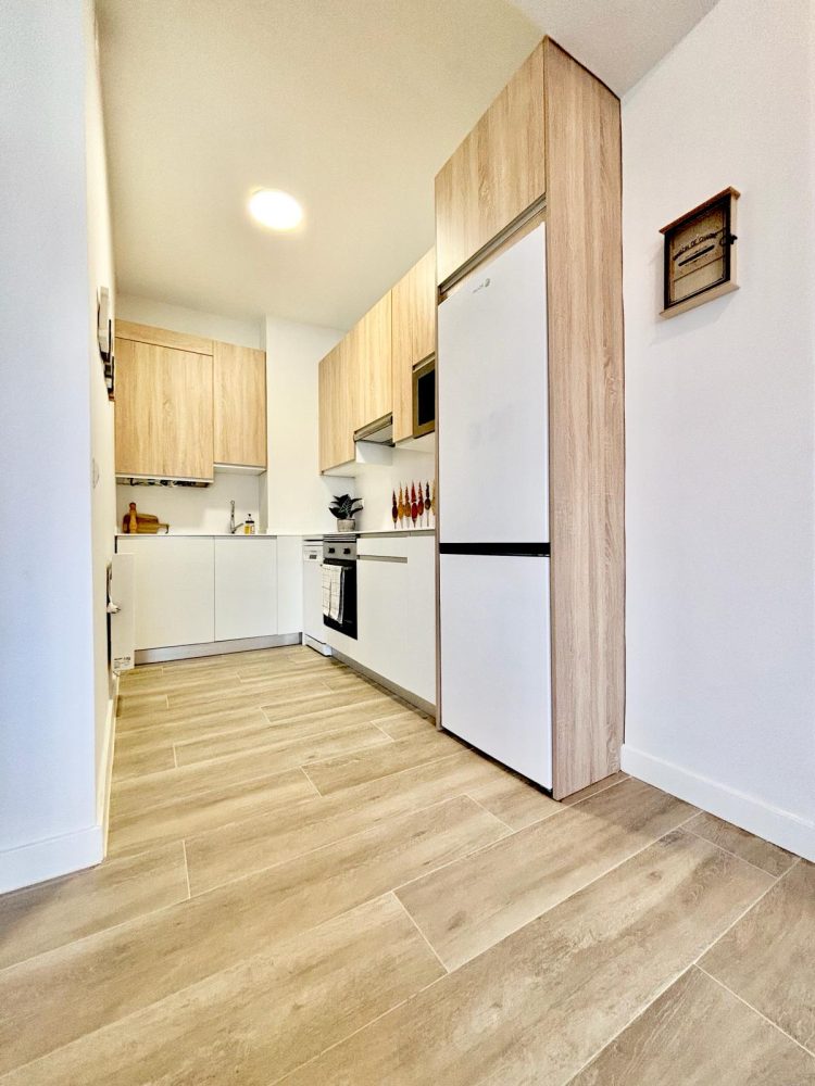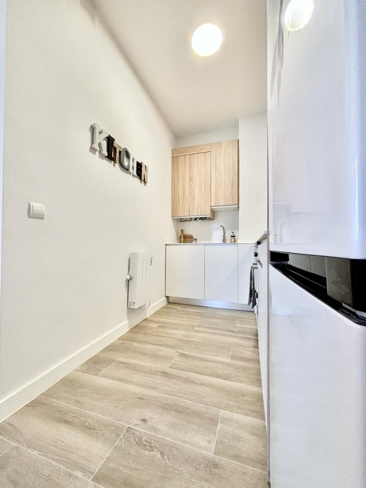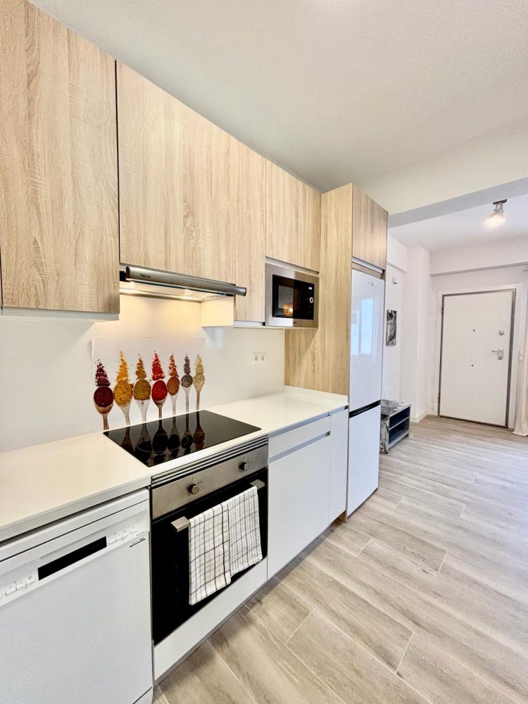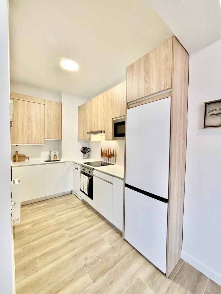 * AMPLIA COCINA AMERICANA CON LUZ LED con modo frío y cálido. Completamente amueblada y equipada con todos los electrodomésticos de primeras marcas, necesarios para el uso diario (frigorífico, horno, lavadora-secadora y microondas integrados, vitrocerámica, termo y lavavajillas de 45cm). Muebles que combinan un estilo nórdico y moderno (gran capacidad de almacenamiento) que aportan a la misma un ambiente cálido y acogedor.