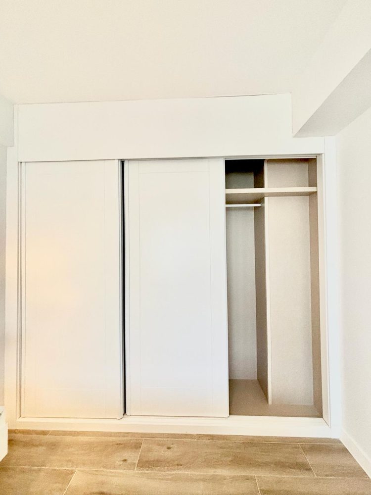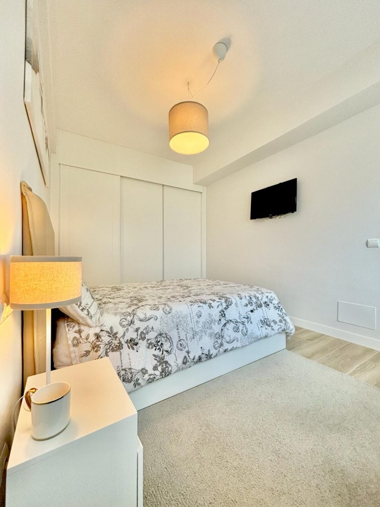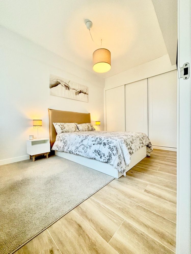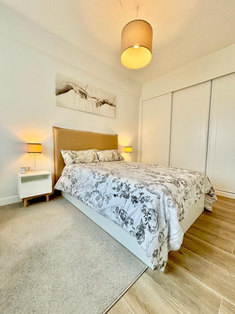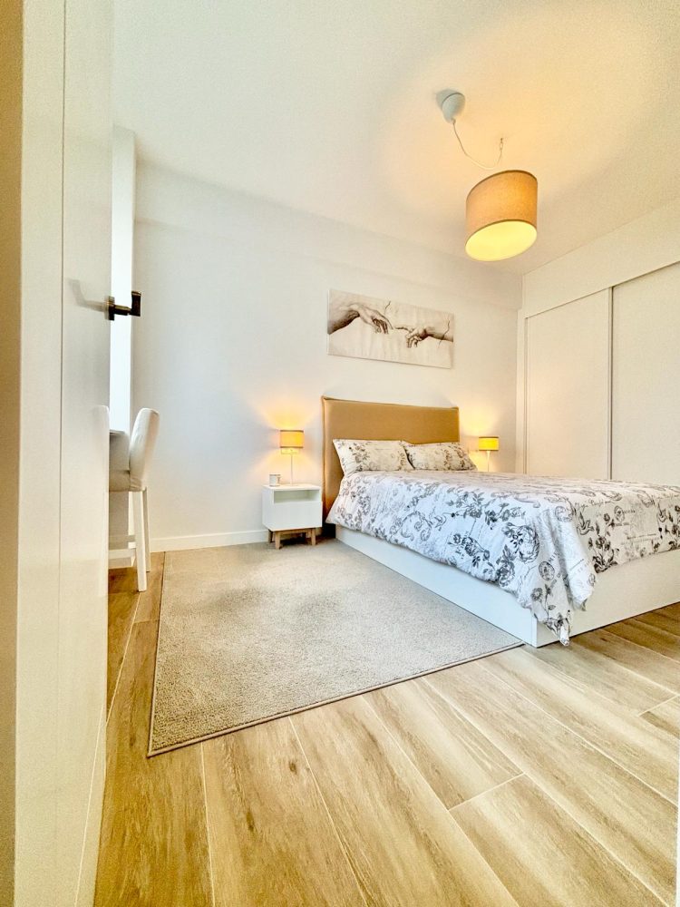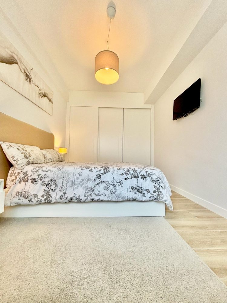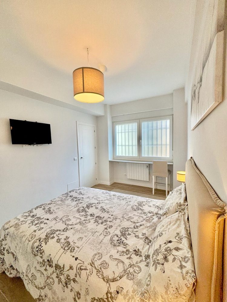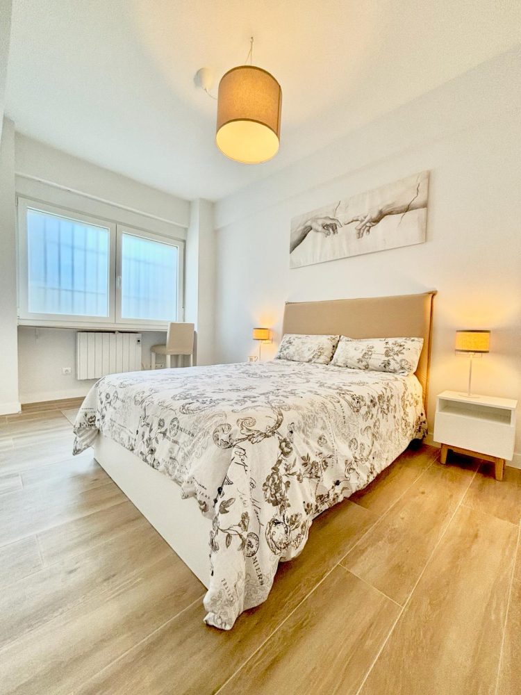 * ESPACIOSO DORMITORIO PRINCIPAL COMPLETAMENTE EXTERIOR Y MUY LUMINOSO. El mismo está equipado con TV, cama canapé y colchón de 1,35m con cabecero y mesillas de noche, cortinas y estores, espacioso armario empotrado de 3 puertas con gran capacidad y revestido interiormente con puertas correderas lacadas en blanco. Dentro del dormitorio encontramos una acogedora y práctica zona de teletrabajo.