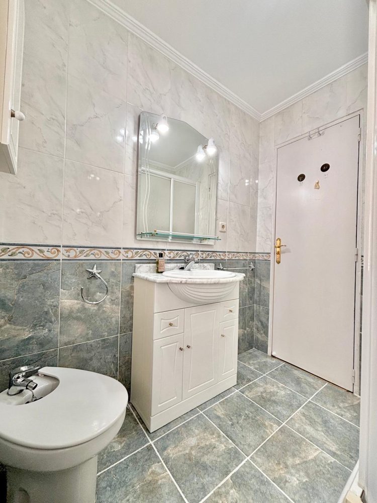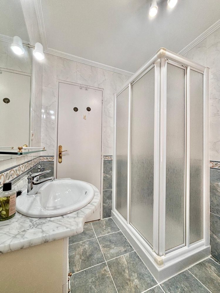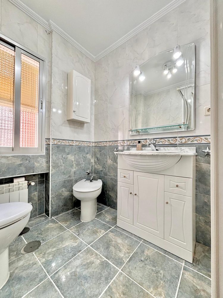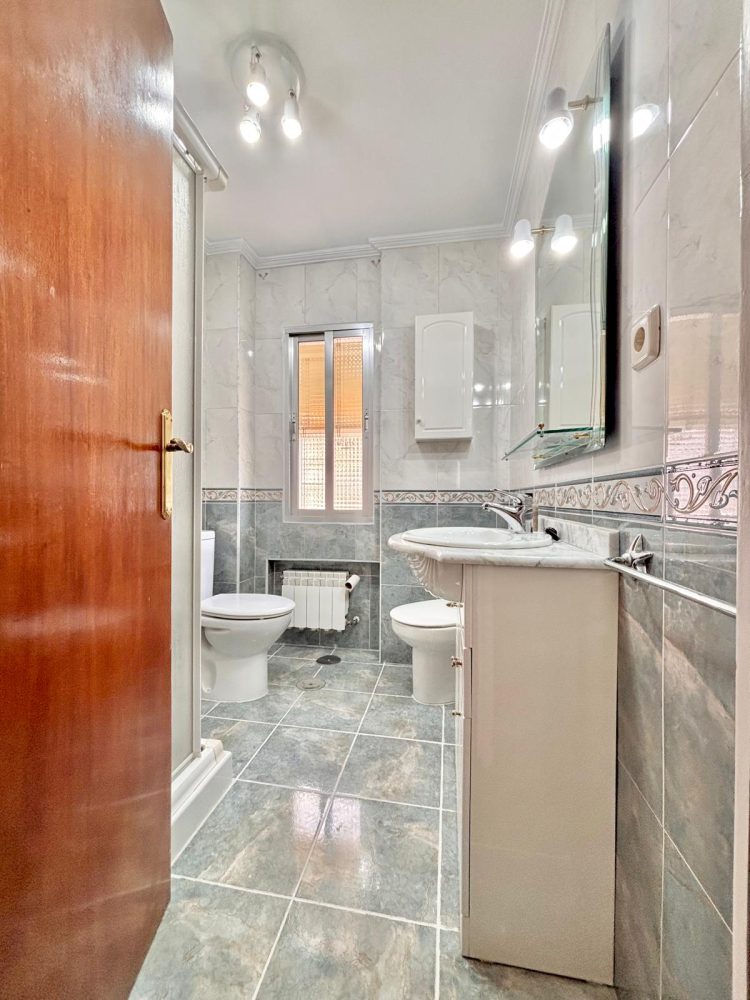* AMPLIO BAÑO completamente EXTERIOR y equipado con saneamientos en perfecto estado, dispone de ventana que favorece la ventilación del mismo. Equipado con lavabo con mueble, plato de ducha con mampara, wc, bidet y práctico mueble auxiliar en pared.