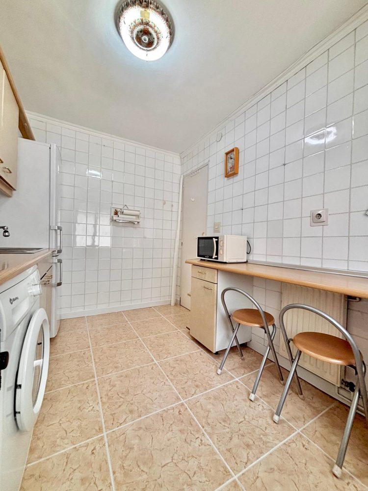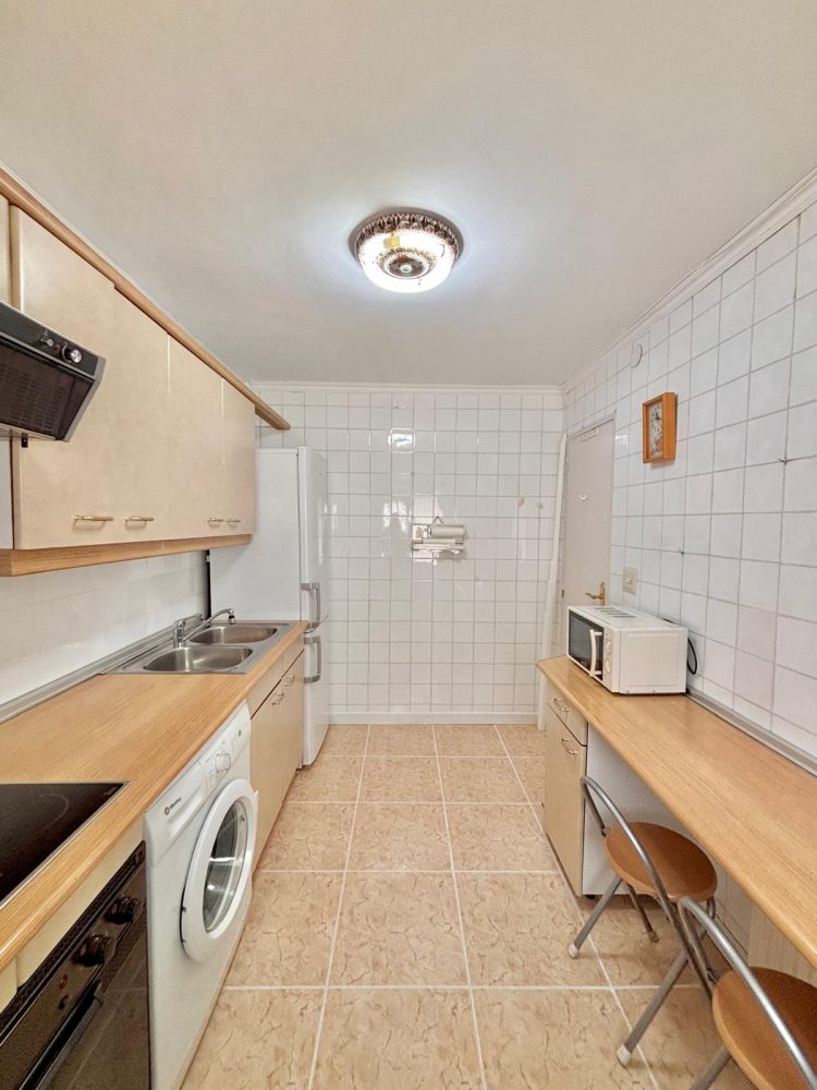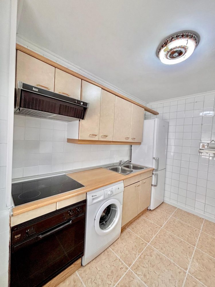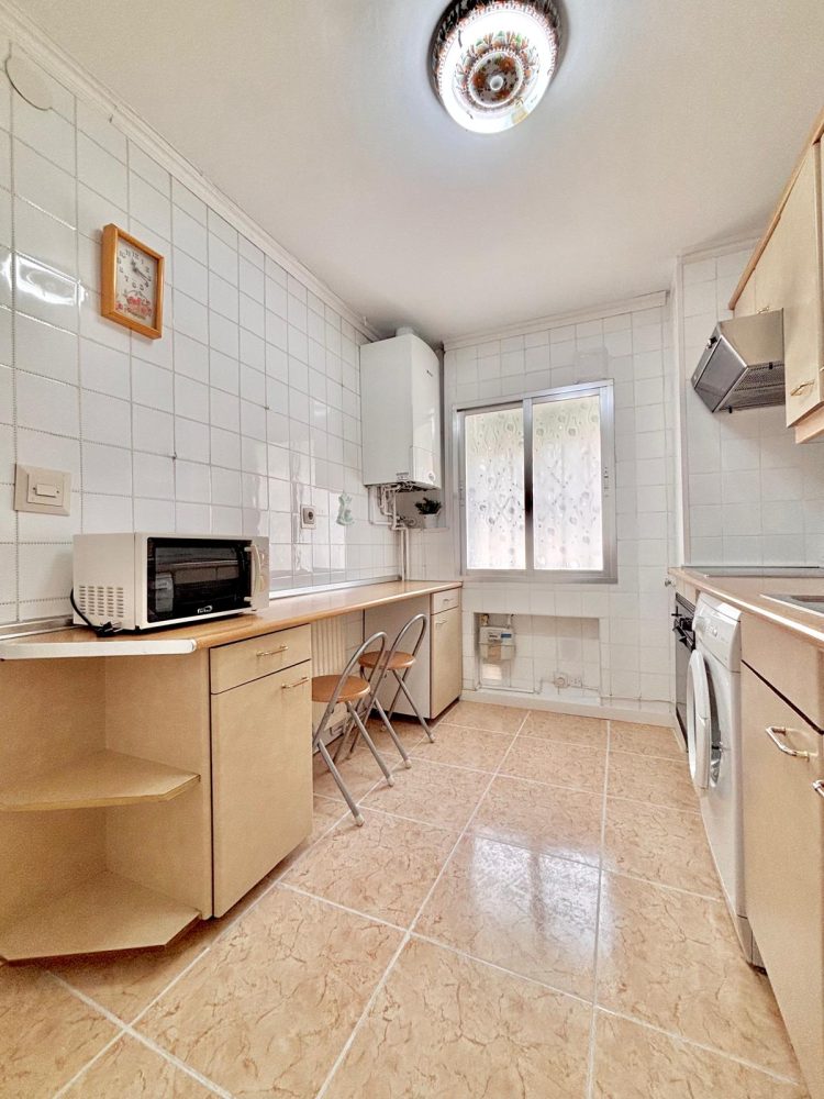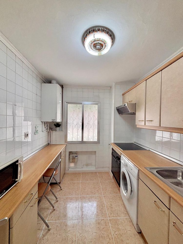 * COCINA INDEPENDIENTE exterior muy luminosa como el resto de las estancias. Completamente amueblada, con gran capacidad de almacenaje y equipada con electrodomésticos de primeras marcas (frigorífico, lavadora, vitrocerámica, campana extractora y horno). Cuenta con barra con sillas.